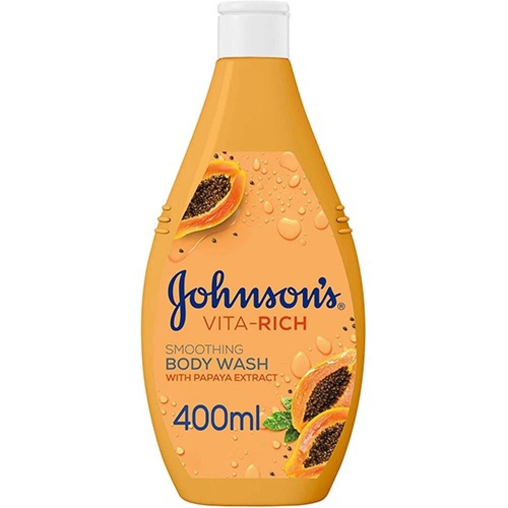 جونسون سائل للإستحمام بالبابايا | 400 ملوصف المنتج:يمنح صابون سائل الاستحمام Vita-Rich نعومة من جونسون بشرتك الجافة ترطيباً يدوم طويلاُ بقوامه الغني واللطيف.غني بالبابايا الذي يقشر ويشد البشرة بالإضافة إلى الجلسرين المُرطب، يعمل صابون سائل الاستحمام Vita-Rich نعومة من جونسون على تغذية بشرتك بفعالية ويمنحها الراحة لمدة 24 ساعة.الفوائد:تركيبته تمنح بشرتك راحة تدوم 24 ساعة.تركيبة غنية ومخملية لترطيب كثيف.يحتوي على البابايا والجلسرين.